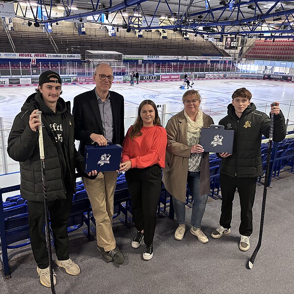 Stellvertretend für die zahlreichen MAV-Mitglieder, die Tickets geordert hatten, waren auch Mitarbeiterinnen eines Ausbildungsbetriebs bei der Übergabe vor Ort. Sonja Leisinger aus der Personalabteilung der HJS Emission Technology GmbH & Co. KG in Menden hatte die kaufmännische Auszubildende Anna Wallnisch mitgebracht. Beide nahmen gemeinsam mit Dr. Andreas Weber, Leiter Öffentlichkeitsarbeit & Bildung beim MAV, den Koffer mit den Tickets entgegen. Weber blickt auf eine rundum gelungene Aktion: „Wir freuen uns über die starke Resonanz. Rund 40 Unternehmen haben wieder 580 Tickets bestellt.“ Die MAV-Aktion umfasst Tickets für folgende Heimspiele der Roosters: