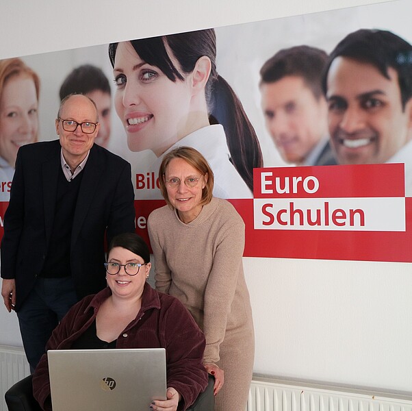 Rechts: Astrid Lenhard, Leiterin der Euro-Schulen Märkischer Kreis. Vorne: Dozentin Janine Niedzwiecki. Links: Dr. Andreas Weber, Leiter Öffentlichkeitsarbeit & Bildung beim MAV, der das Projekt organisatorisch begleitet.